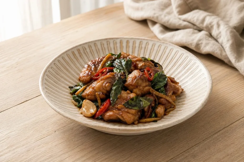 - 關火後放入九層塔快速翻拌,利用餘溫讓香氣釋出,立即盛盤上桌。